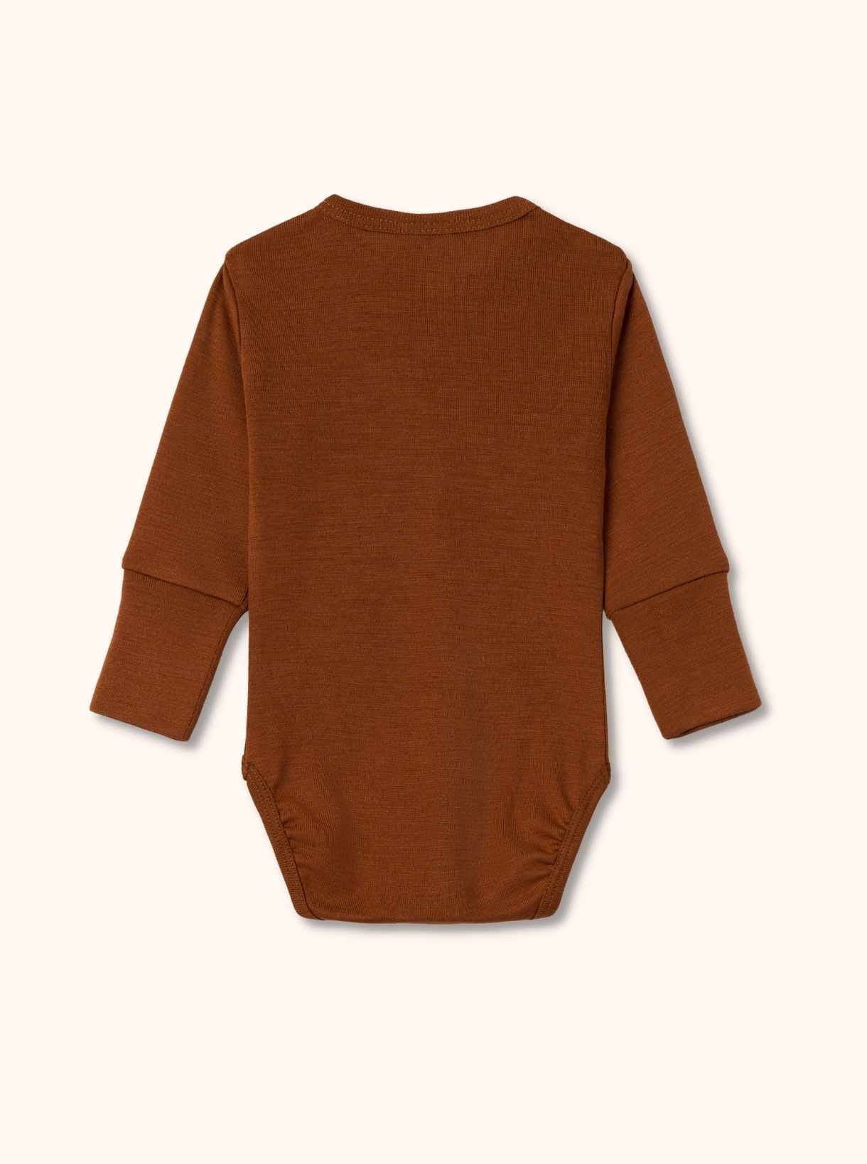 Body niemowlęce z długim rękawem z wełny merynosów i jedwabiu. Wyprodukowane z organicznej dzianiny z certyfikatem GOTS w kolorze brązowym. Zaprojektowane tak, aby rosło razem z dzieckiem. Dzięki sprytnym rozwiązaniom idealnie leży i pasuje przez cały okres użytkowania i wystarczy nawet na 3 rozmiary: