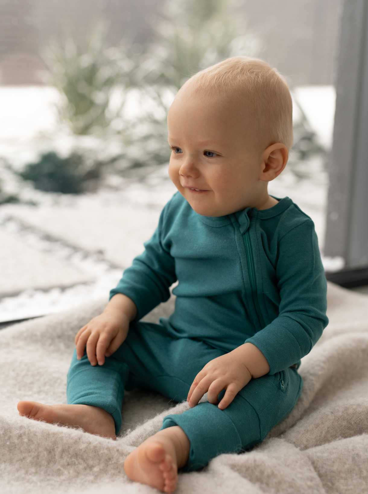 Nasze kombinezony dla niemowląt wykonane są z 70% miękkiej wełny merino i 30% jedwabiu z naturalnej, ekologicznej dzianiny z certyfikatem GOTS.